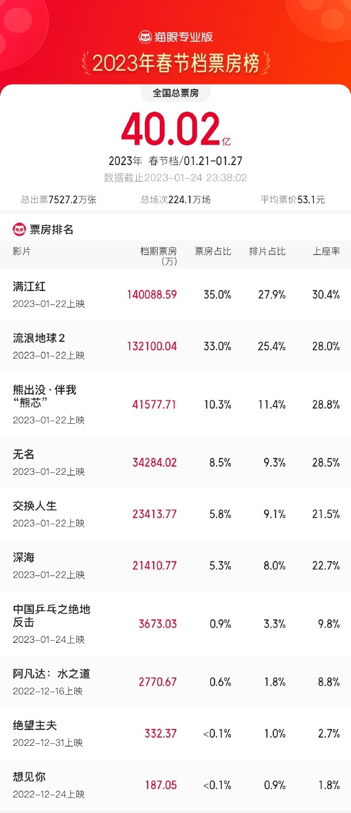 NO.2 据猫眼专业版数据显示,1月24日23时33分,2023年春节档(1月21日-1月27日)总票房(含预售)超40亿元。《满江红》总票房破14亿元,超过《流浪地球2》的13亿元,暂列第一。???灯塔专业版数据显示,1月24日17时41分,吴京的个人总票房达到300亿元,成为中国影史首个达到此票房成就的演员。