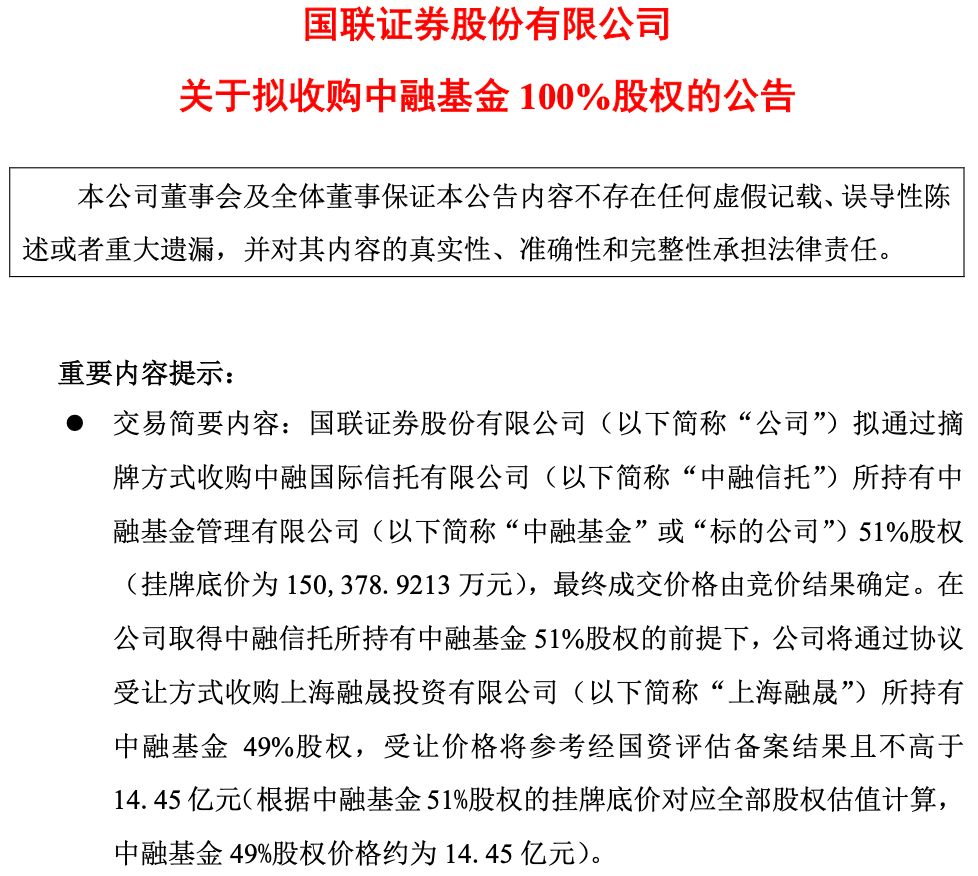 2月7日晚,国联证券公告称,拟通过摘牌方式收购中融国际信托所持有中融基金51%股权。后续将在取得上述51%股权的前提下,进一步通过协议受让方式收购剩余49%股权,以达到最终全资控股中融基金的目标。