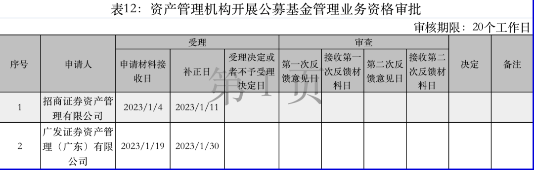 招商证券和广发证券的资管子公司也在上个月相继递交材料,申请公募业务资格。其中招商证券资管的申请材料已于1月4日获得接收,广发证券资管的材料接收日则为1月19日,目前两家券商资管的申请都已进入补正阶段。
